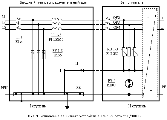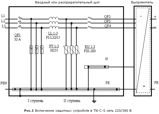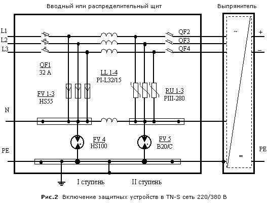 Ниже изложены предлагаемые нами технические решения. Для промышленных объектов, имеющих в своем составе возвышающиеся конструкции, для объектов связи, имеющих высокие антенно-мачтовые сооружения (АМС) или при воздушном вводе электропитания сети 220/380 В, рекомендуется применение как минимум двухступенчатой схемы защиты от перенапряжений (с применением устройств первого и второго класса согласно ГОСТ Р 51992-2002 (МЭК 61643-1-98) "Устройства для защиты от импульсных перенапряжений в низковольтных силовых распределительных системах. Часть 1. Требования к работоспособности и методы испытаний".