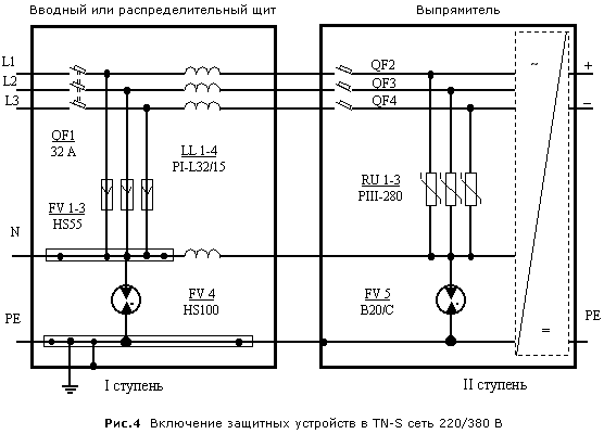 3. В любом случае во вводном щитке необходимо установить импульсные разделительные дроссели, так как габаритные размеры объекта контейнерного типа не позволят обеспечить разнесение устройств защиты I и II ступеней на 10 м по длине кабеля. При применении дросселей необходимо предусмотреть на вводе в электроустановку или в той линии, где они установлены, устройства защиты от сверхтоков (автоматические выключатели или предохранители), которые смогут защитить дроссели и проводники электроустановки от токов перегрузки и короткого замыкания. На рисунках 1-4 в качестве примера приведены дроссели PI-L32/15 и, соответственно, автоматические выключатели с номинальным током 32 А.