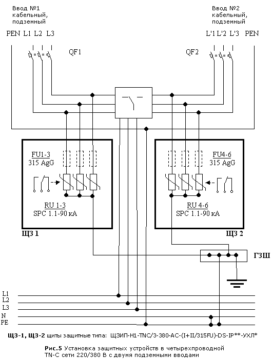 Для объектов с кабельным подземным вводом электрического питания возможно применение комбинированных варисторных УЗИП типа SPC3, SPC3.1, SPC1, SPC1.1, которые по своим входным параметрам соответствуют требованиям к защитным устройствам первого класса (способность отводить импульс тока величиной 10 - 25 кА; формы 10/350 мкс). По своим выходным параметрам (уровень защиты (Up) 1300 - 1700 В при номинальном импульсном токе формы 8/20 мкс) они выполняют требования ко второму классу защиты. Применение подобных устройств позволяет отказаться от использования разделительных дросселей. Пример установки комбинированных УЗИП для объекта, имеющего два ввода электропитания, приведен на рис. 5.