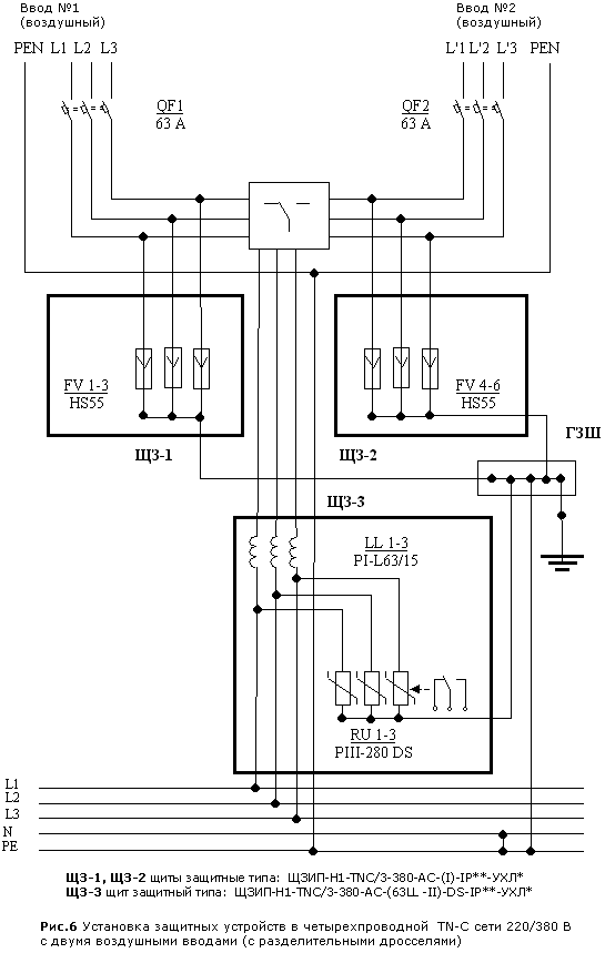 В том случае если дроссели все же применяются, необходимо предусмотреть на вводе в электроустановку или в той линии, где установлены дроссели, устройства защиты от сверхтоков (автоматические выключатели или предохранители) соответствующего номинала, которые смогут защитить дроссели и проводники электроустановки от токов перегрузки и короткого замыкания. Пример подобного решения приведен на рисунке 6. В данном случае применение предохранителей, включенных последовательно с каждым УЗИП, становится технически нецелесообразным, так как предусмотренные производителем УЗИП номиналы предохранителей превышают номиналы предусмотренных модельным рядом разделительных дросселей (максимальное значение 120А).