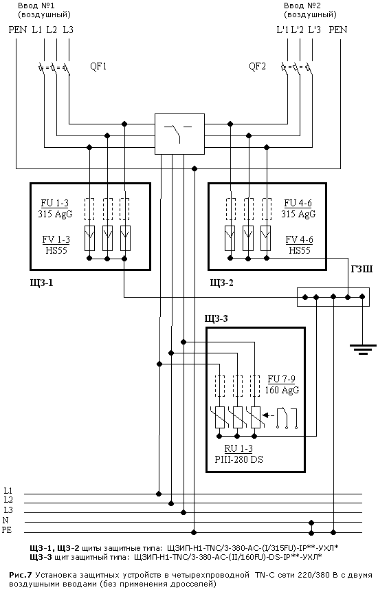 При отсутствии дросселей в схеме защиты (рис. 5, 6), необходимо обеспечить защиту электроустановки от аварийных режимов короткого замыкания в УЗИП при помощи включения последовательно с ними предохранителей с номиналом, предложенным в технических условиях изготовителя данных устройств. Предохранители можно не устанавливать при очевидно более низком номинальном значении устройства защиты от сверхтоков (автоматического выключателя или предохранителя), установленного перед точкой включения УЗИП по ходу электроэнергии.