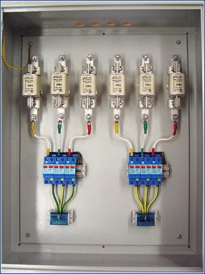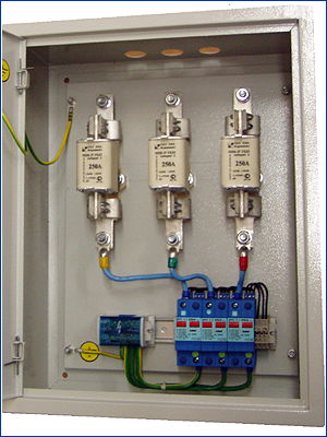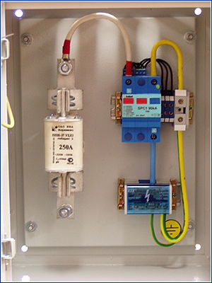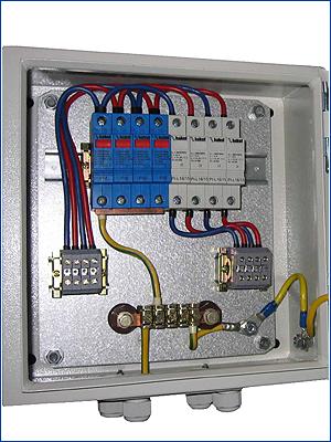 Щиток соединительно защитный ЩСЗ СОМ для защиты электропитающей установки объекта связи со стороны линии питания огней СОМ (светоограждения антено-мачтового сооружения) или другого оборудования, установленного на мачте и получающего питание из технического здания узла связи. Разработан по спецзаказу.