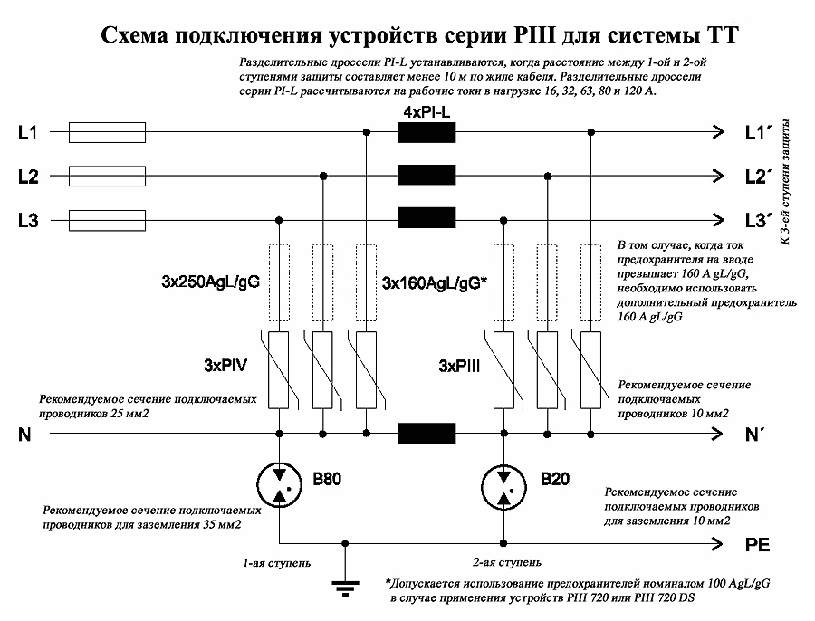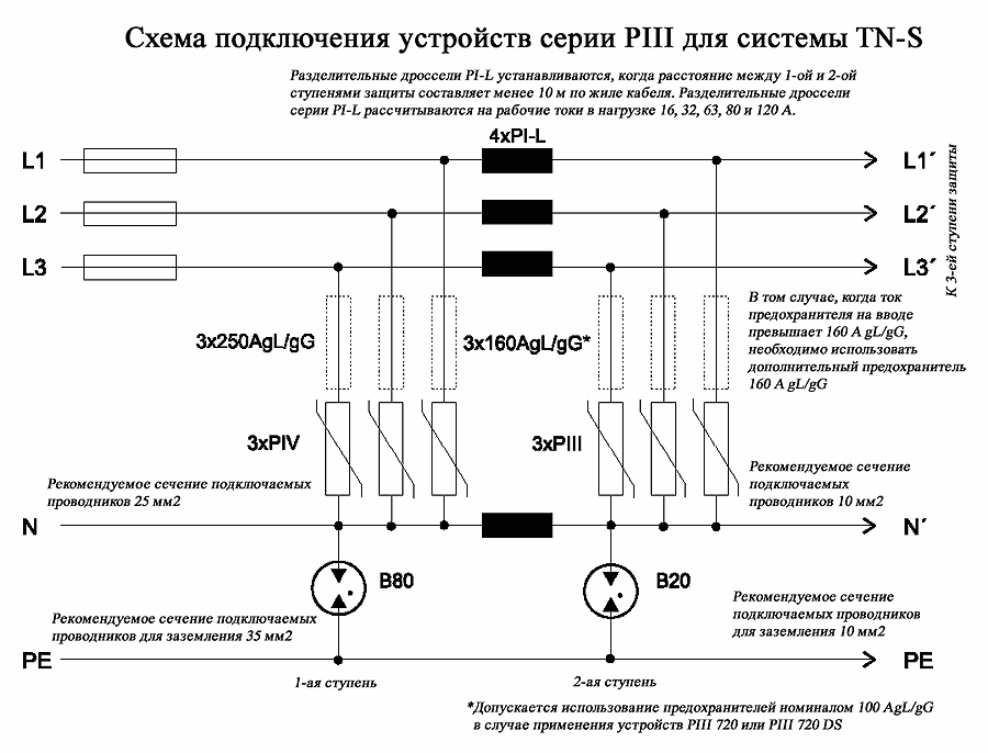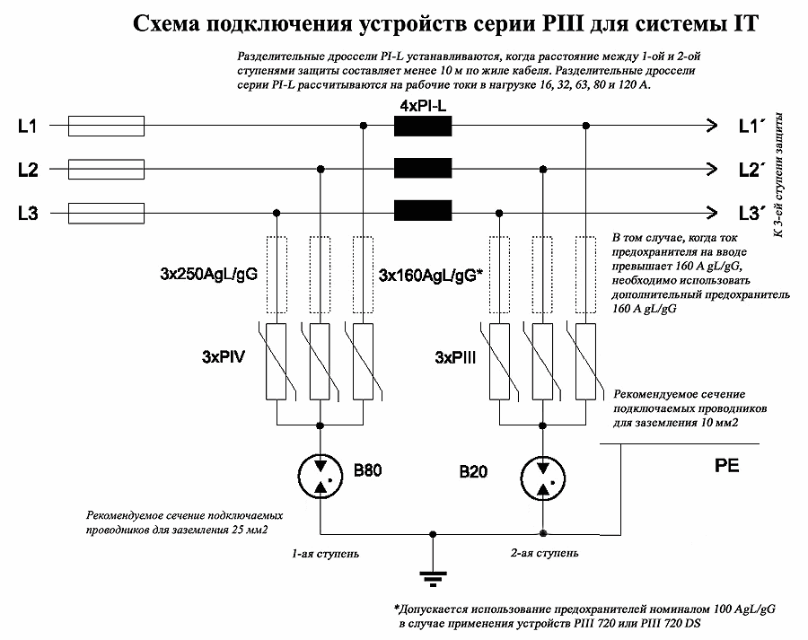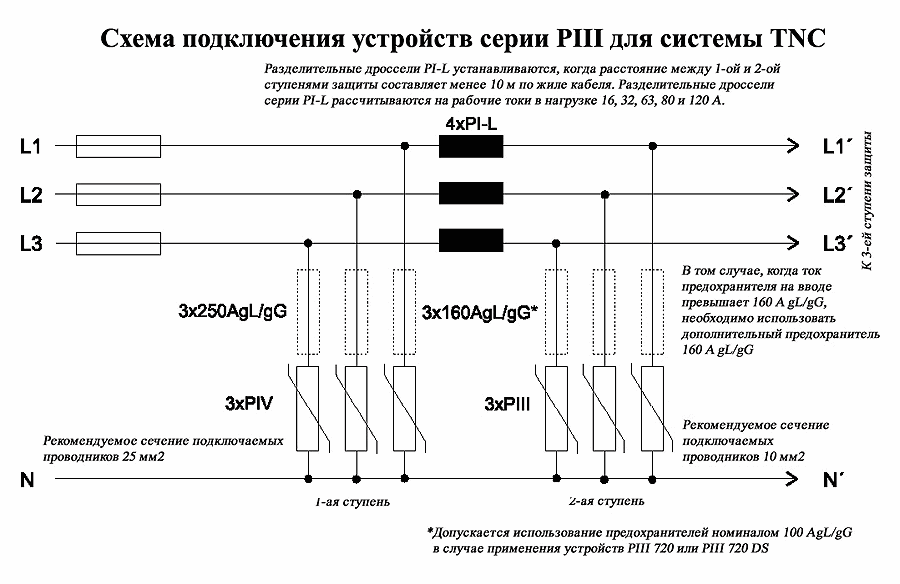 Устройства серии PIII* соответствуют II-му классу УЗИП, согласно ГОСТ Р 51992-2002 (МЭК 61643-1-98). Применяются в низковольтных силовых распределительных системах в пределах 0В - 1 зон молниезащиты (в соответствии с МЭК 1312-1, МЭК 62305 и CO-153-34.21.122-2003). УЗИП серии PIII* имеют в своем составе варисторы и устанавливаются после УЗИП I-го класса во вводные или вторичные распределительные щиты и используются в сетях типа TNC, TNS, IT и TT.