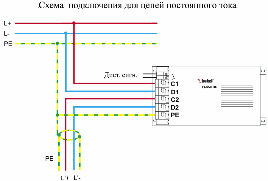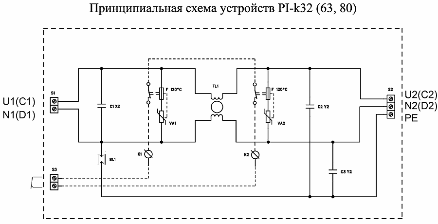 УЗИП выполнено по двухступенчатой схеме на варисторах (L/N) и разряднике (N/PE). Варисторы снабжены внутренними терморасцепителями, которые срабатывают при повреждении (перегреве) варисторов. Индикация состояния расцепителей осуществляется с помощью сигнальных кнопок, расположенных на корпусе устройства, а также с помощью дистанционной сигнализации (переключением «су контактов). Фильтры серии PI-k (32-150А) устанавливаются во вводной щит или во вторичный распределительный (этажный) щит после II ступени защиты.