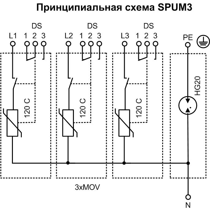 Все УЗИП этой серии снабжаются внутренними терморасцепителями, которые срабатывают при повреждении (перегреве) варисторов. Индикация состояния расцепителей осуществляется с помощью сигнальной кнопки красного цвета расположенной на корпусе устройства, а также с помощью дистанционной сигнализации (переключением «сухих» контактов) для серии SPUM3* DS.